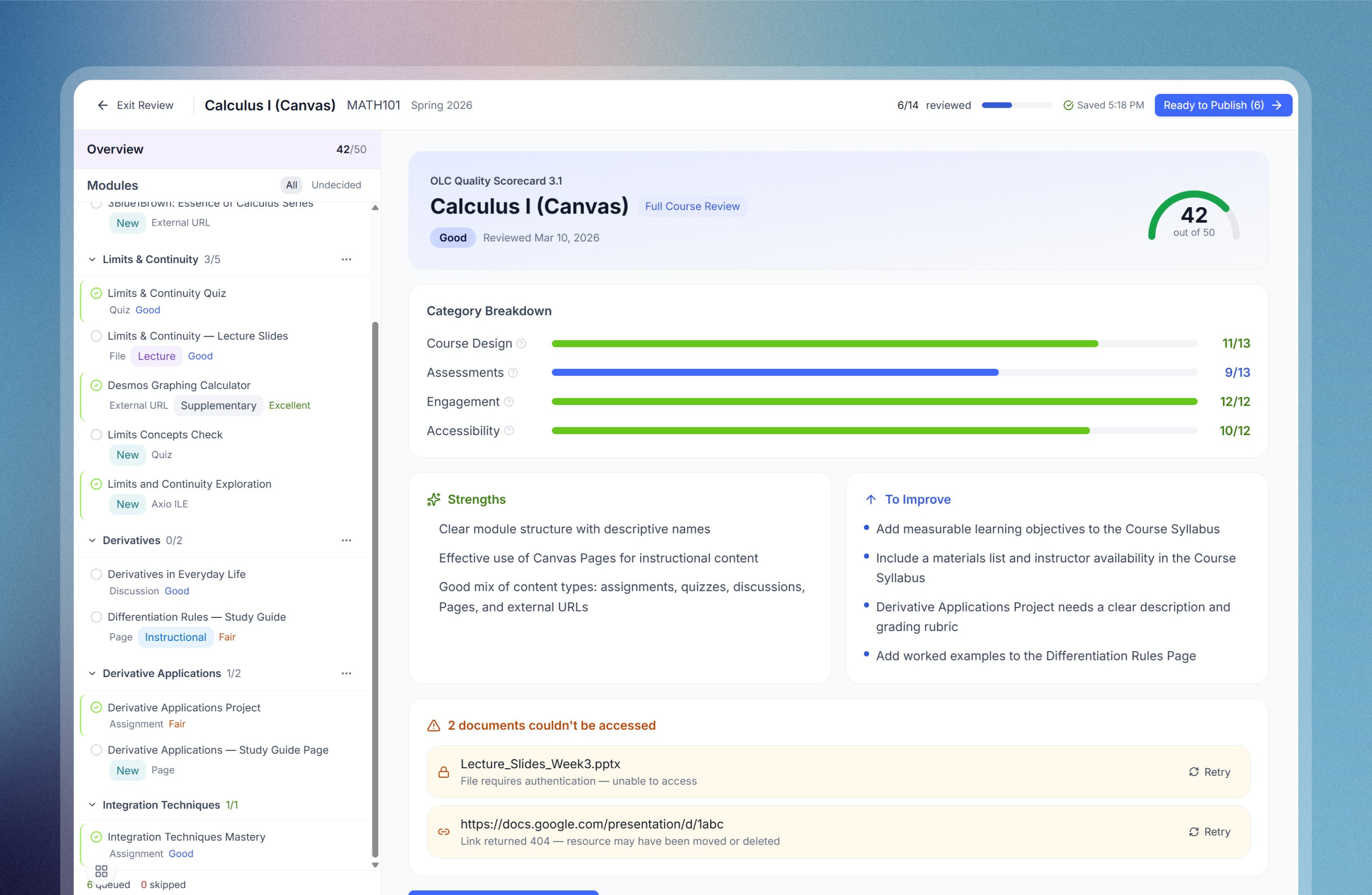 Scores every course against alignment criteria so admins can pinpoint gaps at a glance