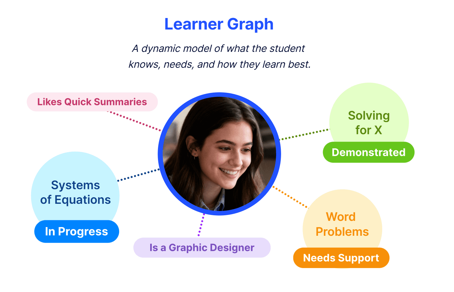 Working alongside this is what we call the learner graph: an evolving representation of how a specific student engages with material, where they struggle, what approaches resonate, and how their understanding develops over time.